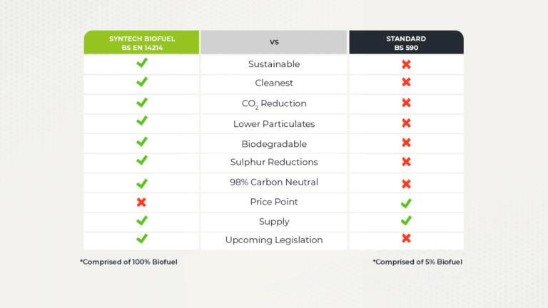 Our sustainable biofuel, Syntech ASB, is produced to the British and European standard BS EN 14214 and is regularly tested to ensure this is always the case. This means it is of the highest quality.